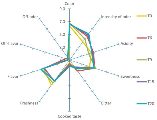 During the storage of treated juice (PEFJ), only the intensity of the odor (p ≤ 0.01) and the sweetness (p ≤ 0.05) descriptors were found to be statistically different. In fact, the first increased from T0 to T20, and the second had an opposite trend. The other sensory descriptors did not undergo variations compared to T0 (Figure 8).