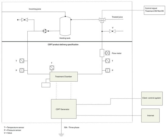 NFC blood orange juice was subjected to PEF treatment by adopting the juiceCEPT+® equipment distributed by Opticept technologies AB (Lund, Sweden). The juiceCEPT+® is a pre-assembled, plug and play unit (Figure 9). The components are hygienically designed in compliance with EHEDG provisions. It consists of a PEF high-voltage generator and a cabinet with an optimized booster step (treatment chamber). The equipment continuously monitors and logs the product conductivity, pressures, temperatures, product flow, and power level. These sensors provide valuable information about the treatment process and allow for complete quality assurance and process safety. The treatment is only enabled when there is enough flow through the system, and the integrated control valve ensures the maximum flow rate is not exceeded. Any amount of product that has not been sufficiently treated is returned through a 3-way valve. The equipment generates near-squared pulses in both monopolar and bipolar modes with an infinitesimally short rise time. The pulse generator has a maximum voltage of 8 kV, which generates the required electric field during the treatment, and maximum power of 8.4 kW. The number of pulses and treatment time (µS) may be modulated to adapt the treatment to the product. The treatment intensity recorded in terms of energy density was varied during the treatments by either increasing the power or decreasing the flow rate, wherein the energy density ranged from 120 to 200 kJ/kg of the product. The process connection is made from stainless steel and is food-grade. The patented 3D-printed treatment chamber is made from Nylon 12/PA12 and its two parallel parallelepiped electrodes are made from titanium covered with a noble metal coating for quick replacement and long life. The juiceCEPT+® is operated via a Siemens-based PLC system based on digital start/stop signals or complete integration to end users’ PLC systems. The juiceCEPT+® is CE certified, meaning it is qualified to work safely. All cables and protective devices are designed and sized to comply with the EU Safety Directive and the relevant Electrical and Current Directives. The EMC Directive is equally guaranteed and certified by a qualified external body, ensuring zero emissions both via air and cables.