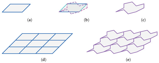 Hence, these tiles can be used to construct the desired interlocking blocks. First, the construction of the square-block is described. For simplicity, the square s in Figure 6a is assumed to be given by the convex hull . This results in the modified square tile in Figure 6a being placed in the Euclidean plane such that the points lie on the boundary of the tile. Thus, let be the set that corresponds to the modified square tile in Figure 6a. Next, let be the set that is obtained by applying a 90 degree rotation around the point to the points in The two sets M and are used to place copies of the modified square tile on three parallel planes in In particular, this is achieved by defining the sets and by