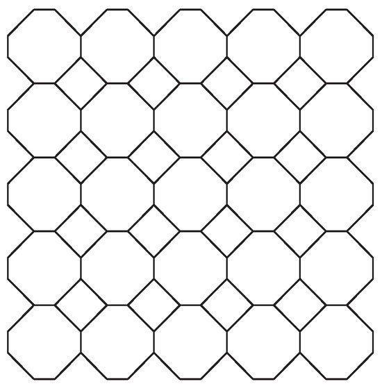 In the following, the semi-regular tiling known as the truncated square tiling (see [29]) is exploited in order to construct a TIA consisting of two different block types. The truncated square tiling is a tiling of the Euclidean plane that consists of infinitely many squares and (regular) octagons satisfying that the edge lengths of all these polygons are the same. Typically, these polygons are scaled such that all edge lengths are equal to 1. In order to realise the truncated square tiling, these polygons are placed in the Euclidean plane, as illustrated in Figure 5.