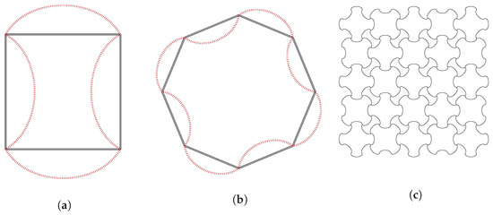 We note that the construction of the block corresponding to the square is inspired by the osteomorphic block that has been introduced in [31]. By using the methods presented in [19,20,32], it could be verified that the assembly shown in Figure 7c is a TIA. In order to establish the interlocking property of the given assembly, we have to choose the corresponding frame as the 20 outer octagon blocks.