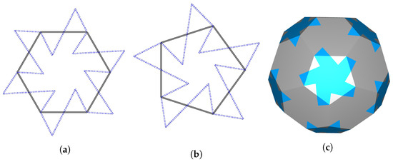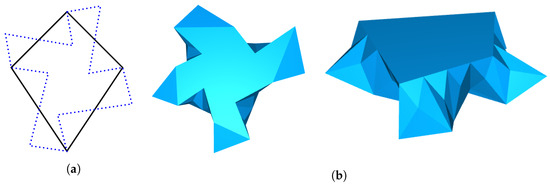 - For , the tile is constructed by deforming the edges of the hexagonal face such that the projection of the tile onto a plane containing the face is the polygon that is indicated by the blue dotted lines in Figure 9a.
