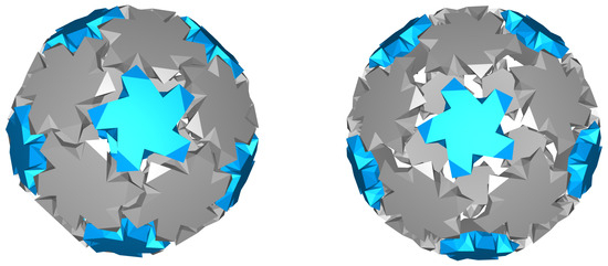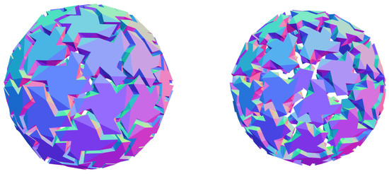 Lastly, the modified Escher-like approach is used to construct a TIA that is derived from manipulating the surface of a Catalan solid. The Catalan solids are the polyhedra that form the duals of the Archimedean solids. Hence, these 13 polyhedra are face-transitive. Here, the deltoidal hexecontahedron is introduced in order to exemplify another construction of a TIA that is based on a convex polyhedron. Since the deltoidal hexecontahedron is the Catalan solid consisting of 60 kites as faces (see Figure 16), the TIA that results from applying the modified Escher-like approach to this polyhedron consists of copies of one block type.