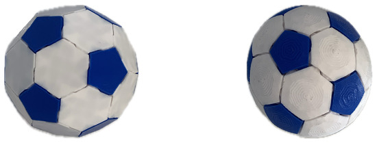 It is not clear how a minimal frame of the TIA illustrated above has to be chosen in order to establish the interlocking property of the given assembly. By employing experiments with 3D-printed assemblies, we observed that the modified Escher-like approach can be iterated in order to construct a TIA with a reduced number of frame blocks. For instance, for and for , it is possible to interpolate between the tiles and between the tiles in such a way that a TIA realising the surface of the truncated icosahedron is constructed. A 3D-printed version of the described assembly is illustrated in Figure 15 on the left. The interlocking property of this assembly can be computationally verified by choosing any two blocks as the frame.