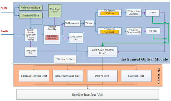 Figure 1 shows a block diagram illustrating the operational principle of UVS. Atmospheric backscattered radiation enters the instrument through the primary mirror of the wide-angle telescope system, reflecting off the primary mirror, and is subsequently deflected by the depolarizer. The second mirror of the super wide-angle telescope system focuses the light onto the incident slit of the spectrometer. A dichroic mirror divides the light into two parts: UV1–UV2 channels and the UV-Vis channel. Both parts are directed through plane gratings and imaging objective lenses before being captured by CCD detectors. The detector’s one-dimensionality provides the required spectral distribution of ultraviolet/visible backscattered radiation from the Earth’s atmosphere, while the other dimension gives the spatial distribution in the cross-track direction. The remaining spatial distribution is determined by the satellite’s orbital motion.