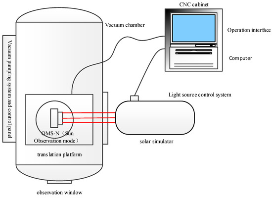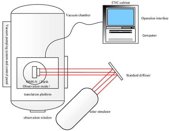 The primary equipment used for calibration included a dedicated oil-free vacuum system, ensuring the optical components of the instrument remained uncontaminated. The vacuum system maintained a level of 6 × 10−4 Pa, with a cleanliness rating of 1000. The UVS comprised a thermal control system to ensure that the temperature was consistent with the in-orbit conditions. A solar simulator was used to provide ultraviolet-visible collimated light. In addition, a five-dimensional mobile station was incorporated to provide various test positions and angles for the instrument, and a standard diffuser calibrated by NIST was adopted as a reference for the BRDF measurements. Additional auxiliary equipment was also used. All tests and calibrations had to be conducted within a clean room environment. Figure 3 and Figure 4 illustrate the schematic diagrams of the vacuum calibration testing system. The inner walls of the vacuum chamber were coated with a black, light-absorbing layer to minimize the impact of stray light. The super-black coating had a thickness of 50 um and exhibited a visible and infrared absorption rate of 0.98 ± 0.01. During calibration, we used liquid nitrogen to lower the temperature of the environment inside the tank, and the UVS was equipped with a temperature control system to ensure that the working environment during calibration matched that in orbit.