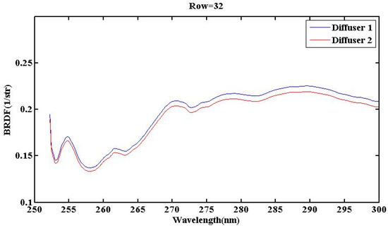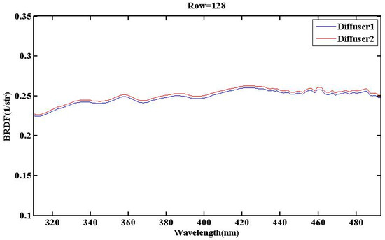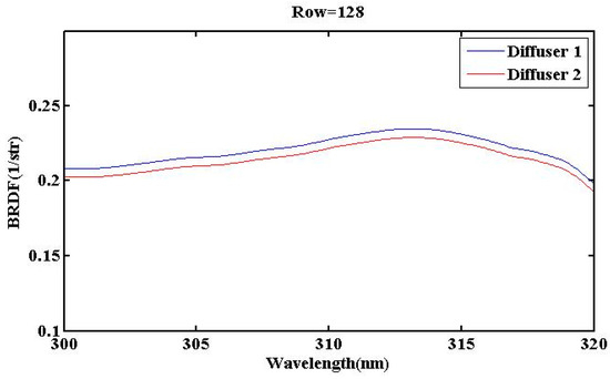 In Section 3, we utilized a transfer formula to calculate the relationship between the UVS BRDF under different incidence angles. The results indicate that, at specific incidence angles, the BRDF exhibits wavelength-dependent and spatial distribution characteristics, leading to varying BRDF characteristics corresponding to each pixel on the CCD image plane. From the results, it is evident that the diffuser’s dependence on wavelength is more pronounced in the 250–300 nm compared to the 300–500 nm. The BRDF characteristics of the diffusers of the UVS were evaluated. Based on radiometric calibrations involving multiple azimuth and elevation angles, a BRDF model was established for each pixel, revealing coefficients for the two diffusers in UVS. From the perspective of spatial distribution at a specific angle, the changes in BRDF are not entirely uniform across a wide field of view, and this phenomenon may be attributed to the intrinsic characteristics of the diffuse reflection board material. Given that all pixels on the UVS have been calibrated, these wavelength-dependent and spatially dependent characteristics can be adjusted through calibration coefficients.
