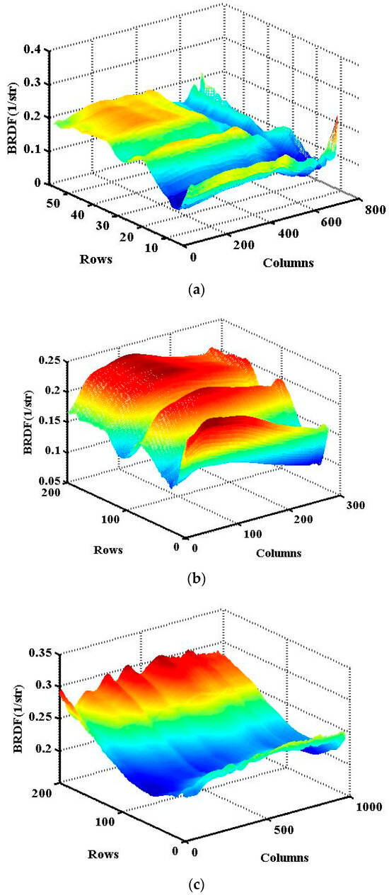 Radiance is used to describe the intensity distribution of a radiation field. It represents the physical quantity of the strength of radiation at a point on a surface radiation source in a specific direction. The unit of radiance is μW/cm2/sr/nm. Irradiance refers to the radiant flux per unit area of the illuminated surface, with the unit being μW/cm2. The BRDF of the diffuse reflection plate on the satellite can be defined as follows [6]: