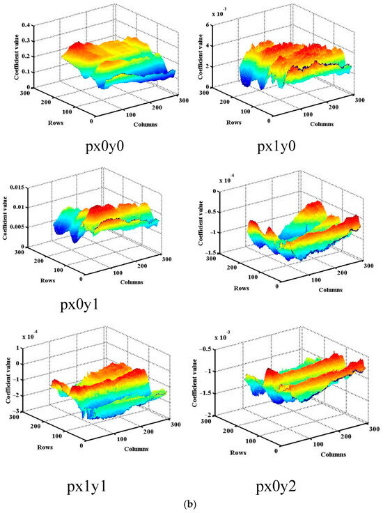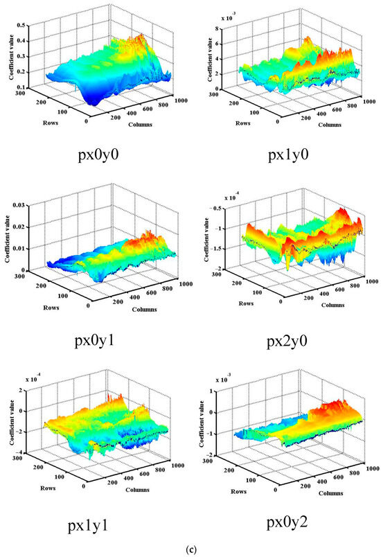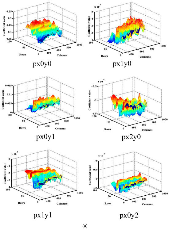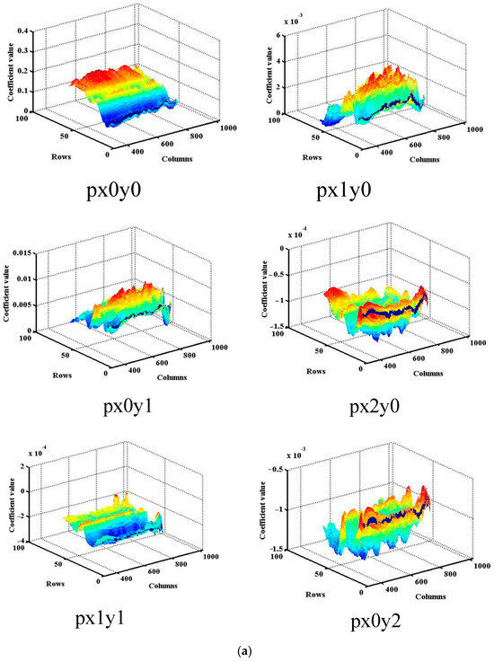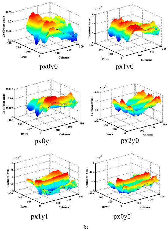 The fitted surface depicts the correlation between the UVS diffuse BRDF and various α and β angles. Figure 9 illustrates the BRDF of diffuser 1 at different azimuth and elevation angles across the three channels. The BRDF, in conjunction with azimuth and elevation angles, conforms well to a quadratic equation. Figure 10 and Figure 11 displays the six coefficients of the fitted curves for all pixels of the two diffusers.