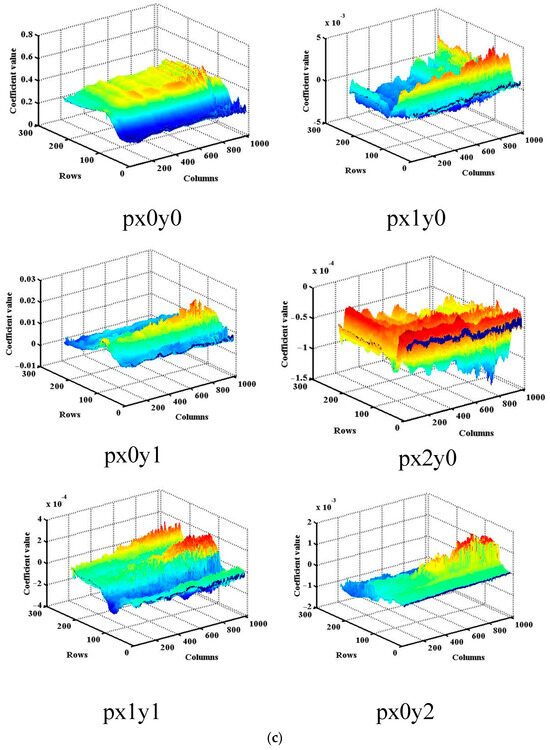 (a–c) Six fitting coefficients of diffuser 2 in the UV1, UV2, and VIS channels. (a) The fit coefficients of diffuser 2 in the UV1 channel. (b) The fitting coefficients of diffuser 2 in the UV2 channel. (c) The fitting coefficients of diffuser 2 in the VIS channel.