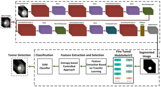This diagrammatic representation systematically encapsulates the fusion of convolutional neural networks with sophisticated classification algorithms, crafting a comprehensive medical imaging solution. This integration aims to elevate diagnostic precision and contribute positively to enhanced healthcare outcomes. The pipeline initiates with the acquisition of source medical images, which are subjected to a series of pre-processing techniques. These techniques typically include normalisation to adjust the pixel values for uniformity across different images, as well as other image-enhancement methods aimed at improving the visual clarity and feature consistency essential for subsequent analysis. The conditioned images are then input into a cascade of convolutional layers. Within each layer, a set of trainable filters executes spatial feature extraction by convolving with the image matrix, thereby capturing hierarchical patterns essential for complex pattern recognition. Post convolution, a rectified linear unit (ReLU) activation function is applied to each feature map to introduce non-linear transformations, which are crucial for learning non-linear complexities in image data. Followed by selective convolutional layers, max pooling operations are executed to downsample the spatial dimensions of the feature maps. This step is pivotal in reducing the computational demand and mitigating the risk of overfitting by emphasising the most salient features and suppressing the less relevant ones. The architecture further includes additional convolutional layers that refine the depth and granularity of feature extraction. Transposed convolutional layers, often referred to as deconvolutional layers, are employed to progressively rescale the feature maps back to higher resolutions, a process essential for maintaining spatial integrity in tasks such as image segmentation. The culmination of the neural network’s processing is the generation of a segmented image. This output distinctly isolates and delineates the regions of interest, such as tumours, from the non-relevant background, enabling precise medical evaluations. Concurrently, the feature maps are exploited in a classification framework, where an SVM classifier operationalizes an entropy-based feature selection methodology. This approach rigorously identifies and utilises the most discriminative features for robust classification of tumour presence. To augment the model’s efficacy, fine-tuning is conducted using MobileNetV2 (Figure 3), a streamlined deep neural network architected for enhanced computational efficiency on mobile and edge devices. This step aims to optimise the trade-off between computational speed and model accuracy. The integrated system outputs both the classification results—indicating the presence or absence of tumours—and the segmented images visually highlighting the tumour regions.