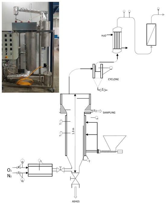 The equipment used consists of a biomass gasification plant based on atmospheric pressure bubbling fluidized bed technology and built of AISI 304 stainless steel for high temperatures, as shown in Figure 1. The bench-scale plant can be divided into five large interconnected modules, which are the following: (i) the feed system of the agent or gasification agents; (ii) the solid feed system; (iii) the gasification reactor and electric oven; (iv) the gas purification system; and (v) the monitoring and control systems. Sand particles were used as bed material during the gasification experiments, with a mean size of 200 µm.
