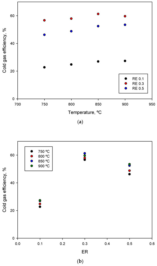 Figure 2a shows the effect of temperature on cold gas efficiency for the three ER levels studied. The results show values ranging from 22.7% (700 °C; ER 0.1) to 61.2% (850 °C; ER 0.3). The relatively low efficiency values may be because the light hydrocarbon content of the resulting gas was not considered for the LHVgas calculation. On the other hand, generally, for a specific ER, a temperature increase shows an increase in the efficiency of cold gas. However, for a 0.3 ER, the variations between the cold gas efficiency values were barely affected by the temperature, even showing a slight decrease when the temperature increased from 850 to 900 °C. If you analyze the three ER levels in more detail, you can see how the lowest efficiency values were found for a 0.1 ER.