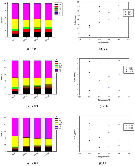 Effect of temperature on the molar composition of the gas for the three levels of ER studied (blue is presented in (a) (800 °C and 900 °C) and also in (c) (900 °C)).