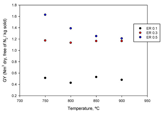 Gas production (GY) is defined as the ratio between the volume flow of the product gas (dry and nitrogen-free) and the volume of the solid. Figure 4 shows that the GY was kept constant by increasing the temperature for ERs of 0.1 and 0.3. However, for a 0.5 ER, the gas production decreased with temperature. This can perhaps be attributed to operational difficulties, such as maintaining consistent temperature profiles and ensuring adequate residence time for reactions. Perhaps these factors contribute to reduced efficiency in gas production. In any case, the changes are small and do not significantly alter the overall conclusions of the study. That is, gas production is especially affected by ER, with the highest GY values obtained (between 1.21 and 1.63) for an ER of 0.5, and this result is in accordance with other works published in the literature such as Lv et al. [37], Sadaka et al. [38], and Taba et al. [24].