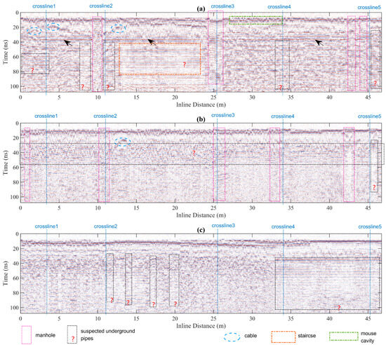 | cluttered (with weak instantaneous energy) | black dashed box in crossline slice in Figure 8d; black dashed box in inline slice in Figure 8c–e; black dashed box (25~55 ns) in both inline and crossline slices in Figure 8f–j; |