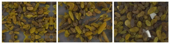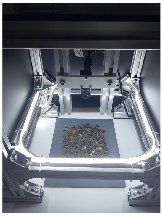 In conventional raisin production, the identification of foreign matter predominantly depends on manual visual inspection, a method that, despite its simplicity, is fraught with inefficiencies [4,5]. Initially, this approach necessitates substantial labor, escalating production expenses and proving impractical for large-scale operations [6,7]. Moreover, the efficacy of manual inspection is constrained by factors such as the inspector’s visual acuity, fatigue, and concentration span, which can result in both oversights and erroneous identifications [8]. In addition, manual detection is difficult to adapt to rapidly changing production environments, and it is hard for inspectors to promptly find foreign bodies that are small or similar in color to raisins.