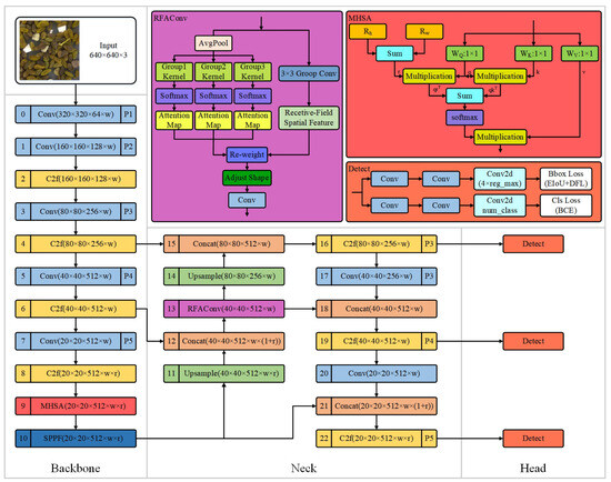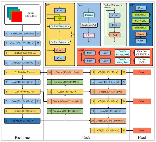 In the backbone network algorithm, the initial convolutional layer has transitioned from the original 6 × 6 convolution to a 3 × 3 convolution. Additionally, the C3 module has been substituted with the C2f module. These modifications have decreased the complexity and parameter count of the model, resulting in a more streamlined design that improves the richness of gradient flow information. In the neck layer algorithm, the 1 × 1 convolutional reduction layer has been eliminated, with the C3 module being replaced by the C2f module. The detection head has been equipped with a decoupled architecture, which separates the classification and regression tasks. Additionally, the anchor-based approach has been replaced with anchor-free, which removes the anchor boxes, simplifying the model design and enhancing adaptability to targets of varying shapes and sizes. This approach diminishes the necessity for extensive hyperparameter adjustment while enhancing the model’s capacity for generalization. In the algorithm for the loss function, Binary Cross-Entropy (BCE) Loss serves as the metric for classification loss, whereas Combined Intersection over Union (CIOU) Loss, in conjunction with Distance Factor (DFL) Loss, is employed for regression loss. BCE Loss optimizes classification performance, CIOU Loss improves the accuracy of bounding box localization, and DFL Loss enhances the model’s focus on difficult examples during training, achieving comprehensive optimization for object detection tasks, particularly improving the detection capability for small objects and class imbalance issues. For the training strategy algorithm, the addition of Mosaic data augmentation in the final 10 epochs has effectively improved accuracy.