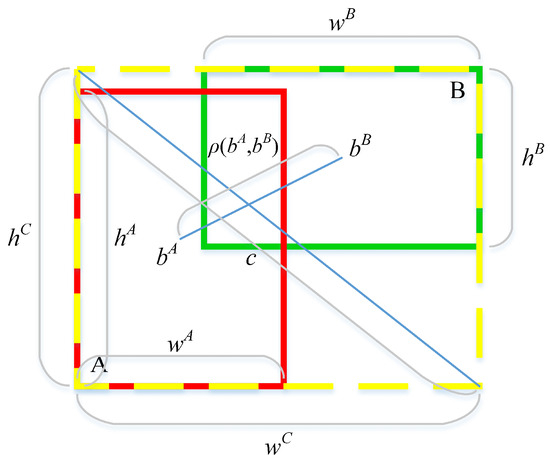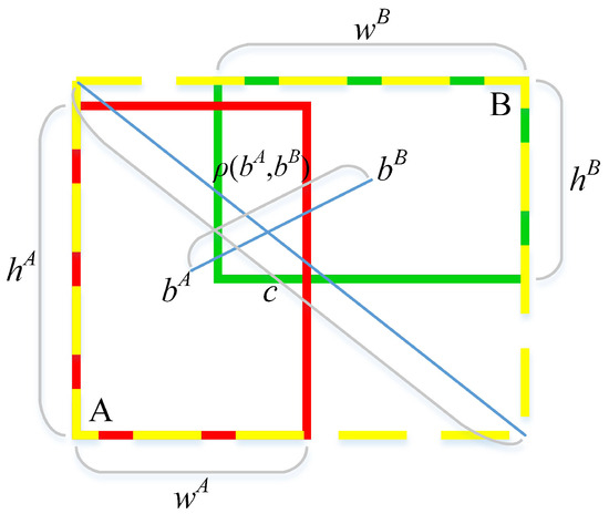 Although the CIoU loss builds upon the DIoU loss [20] by incorporating a penalty for the aspect ratio discrepancy between the estimated and actual boxes, the v component within the term merely indicates the variance in aspect ratio, not the specific interplay of width and height for both boxes. In order to tackle this concern, Zhang Y. F. et al. [21] proposed the EIoU loss based on CIoU loss, as shown in Figure 9. The EIoU loss calculation formula is shown in Equations (6) to (8), where is the width of the smallest bounding rectangle, and is the height of the smallest bounding rectangle. EIoU loss refines the CIoU loss by breaking down the aspect ratio penalty term into separate penalties for the width and height discrepancies between the estimated and actual boxes. This not only resolves the previously mentioned issue but also improves the convergence rate and accuracy of the loss function. Therefore, using EIoU loss helps improve the efficiency and accuracy of raisin foreign matter detection.