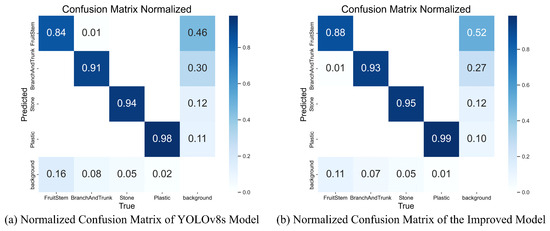 The confusion matrix, a widely utilized instrument for assessing classification model performance, offers a straightforward visualization of how well the model performs across various classes. It offers a clear view of the model’s classification effectiveness by comparing the actual labels with the predicted labels. The normalized confusion matrices for the original YOLOv8s model and the enhanced model are depicted in Figure 10a and Figure 10b, respectively, with the rows corresponding to the actual classes and the columns to the predicted classes. The figures reveal that the enhanced model exhibits enhanced detection capabilities across all categories, particularly noteworthy in the detection of fruit stalks.