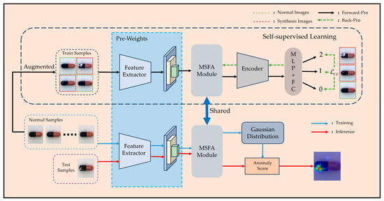 The scarcity of anomaly samples limits the application of supervised learning in anomaly detection. Thus, some researchers have tried to use self-supervision [8,9,10]. Self-supervised learning is often used as a proxy task that learns features from unlabeled data, thereby generalizing to different downstream tasks. In anomaly detection tasks, a self-supervised task is often used to fine-tune a pre-trained CNN feature extractor to reduce the domain bias between natural image classification scenarios and industrial anomaly detection scenarios. Commonly used self-supervised enhancement strategies include rotation [33], deletion [34], color transformation [35], and mixing [8]. MixUp [8] takes two images and their labels, superposing them according to their weights to generate a new dataset and corresponding labels. Based on this, techniques such as [36,37] were developed. MixMatch [9] performs self-supervised learning by augmenting labeled and unlabeled data multiple times. ReConPatch [38] leverages the similarity between patch-level features, employing pairwise similarity and contextual similarity as pseudo-labels for self-supervised learning. The literature [39] achieved self-supervised learning by employing a compact loss to normalize features into a unified distribution prior to reconstructing the feature map.