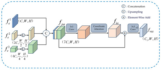 Subsequently, a 1 × 1 point-wise convolution is applied to the concatenated preliminary aggregated feature to initially fuse the channel information. The resulting fused feature, enriched with semantic information, is further enhanced by utilizing Coordinate Attention [45] to boost the representational power of the feature map and highlight crucial spatial location information, resulting in the intermediate aggregated feature as follows: