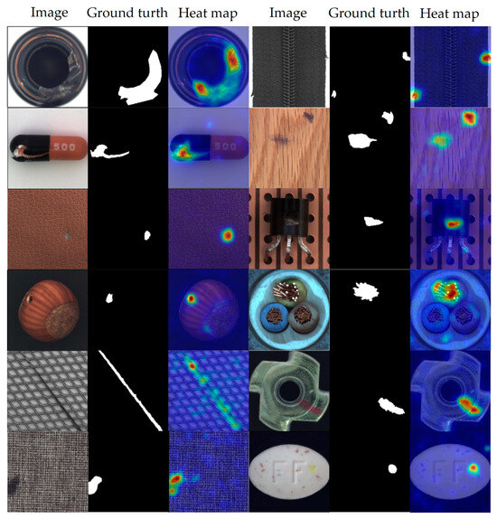 Anomaly visualization of our method on the MVTec dataset. The figure shows the anomaly detection results for a number of categories, for each of which from left to right are test images, ground truth, and predicted heat maps.