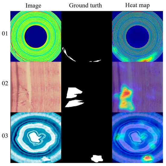 Anomaly visualization of our method on the BTAD dataset. BTAD has a total of three categories, 01, 02, and 03, corresponding to the first to third rows. From left to right, they represent test images, ground truth, and predicted heat maps, respectively.