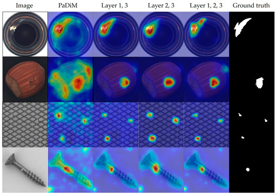 Table 9 presents a further comparison with two state-of-the-art algorithms, PaDiM and CutPaste, to illustrate the advantages of our algorithm. R18 and WR50 stand for ResNet18 and Wide-ResNet50 [50], respectively; RD100 and RD550 denote random downscaling to 100 and 550 dimensions on the channel. Using the same backbone network (ResNet18) and dimension (100), our algorithm has the same memory bank size as PaDiM. However, our image-level AUC score surpasses PaDiM by 5.2%, while the pixel-level AUC score is marginally lower by 0.3%. Compared to the PaDiM-WR50-RD550 with Wide-ResNet50, our image-level AUC remains 0.2% higher, and our memory bank size is nearly 30 times smaller (0.12 vs. 3.5). Despite a 1.1% lower pixel-level AUC, the visualized anomaly scoring maps demonstrate superior results over PaDiM, as shown in Figure 6, possibly owing to our training process. In comparison with CutPaste, our image-level and pixel-level AUCs outperform it by 0.5% and 0.2%, respectively. Meanwhile, CutPaste trains the entire ResNet18 with a total of 11.8M training parameters, while we train only at the feature level with the MSFA module and encoder part, reducing the parameter count to 3.8 M, which is approximately four times smaller than CutPaste.