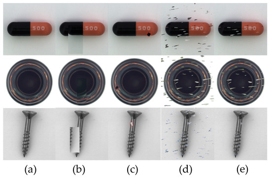 - Bergmann, P.; Fauser, M.; Sattlegger, D.; Steger, C. MVTec AD—A Comprehensive Real-World Dataset for Unsupervised Anomaly Detection. In Proceedings of the 2019 IEEE/CVF Conference on Computer Vision and Pattern Recognition (CVPR), IEEE, Long Beach, CA, USA, 16–20 June 2019; pp. 9584–9592. [Google Scholar]