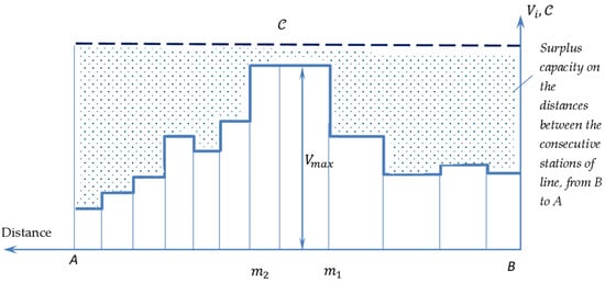 Passenger’s flows expected on the tram line from B end-stop to A end-stop, during a certain time interval of a working day ( maximum flow for the offer planning, with the loading degree, , of each circulating tram; line maximum capacity, provided for a loading degree , (; , the two tram stops with connections to the two metro stations/interchanges).