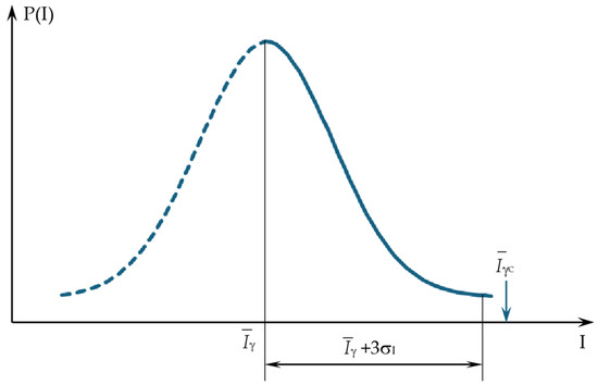 The trams’ headway in current operation, I, is of the nature of a random variable. If we admit that I correspond to a normal distribution, having an average value and the mean square deviation, , then, the condition that the planned interval does not exceed the maximum value (Figure 2) is: