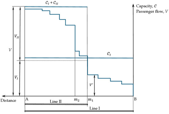 Estimated passenger flows to A during the period (V total flow; , passenger flow on the line I, respectively, on line II; passenger flow in the interchange station, on line I; , potential transport capacities () of the line I, respectively, on line II).