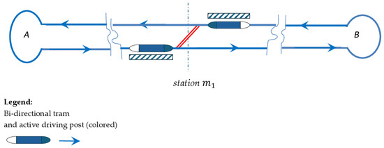 In the case of bi-directional trams together with the crossover links between the tracks corresponding to the two directions of traffic (the diagonal in , for example), the effects of the functionality degradation of the scheduled service can be significantly diminished.