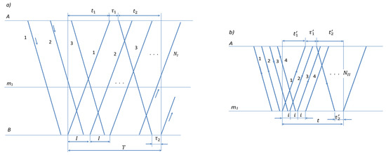 We assume that the 14 trams can be dispatched successively at an average interval of = 3 min, higher than the boarding time of = 300 passengers/tram (the trams are equipped with double doors and a lowered floor). It follows that this rate of dispatching of the 14 trams can be maintained for a duration of 14 × 3 = 42 min. According to Equation (18), the additional number of trams, arrives in B from line I at the interval = 75/6 min. However, the additional trams 3 trams can be dispatched in the same 3 min. It means that, for a duration of 51 min (according to Equation (17)) the number of 17 trams is dispatched at the interval of 3 min. Since , it means that in end-stop B there are at least 3 trams to continue the 3-min pace of dispatches, in the remaining period = 9 min.