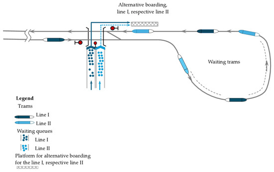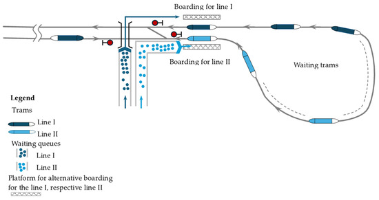 The invoked equity of the pace of advancement of the two boarding lines can also be achieved by allocating distinct platforms to each line (Figure 7). Boarding the tram of line I is performed simultaneously with boarding the tram of line II.