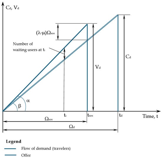 The discharge flow and the offered capacity (–the period during which spectators arrive in the boarding area with the average intensity —the period during which the boarding offer is maintained at the average value the flow of users remaining in the waiting lines at the moment , to be served until ).