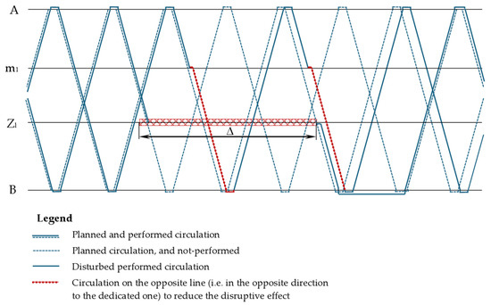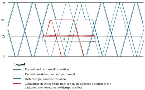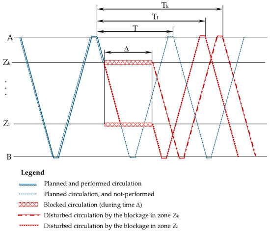 Deviations from the scheduled circulation caused by an event that blocks it in the zone or the zone , in the direction from A to B, for the duration (T, , —the programmed operating cycles, respectively in case of blocking in the zone , or zone ).