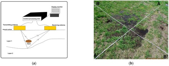 Figure 1. (a) Illustration of GPR system units and EM pulse energy paths. (b) Field measurement layout.