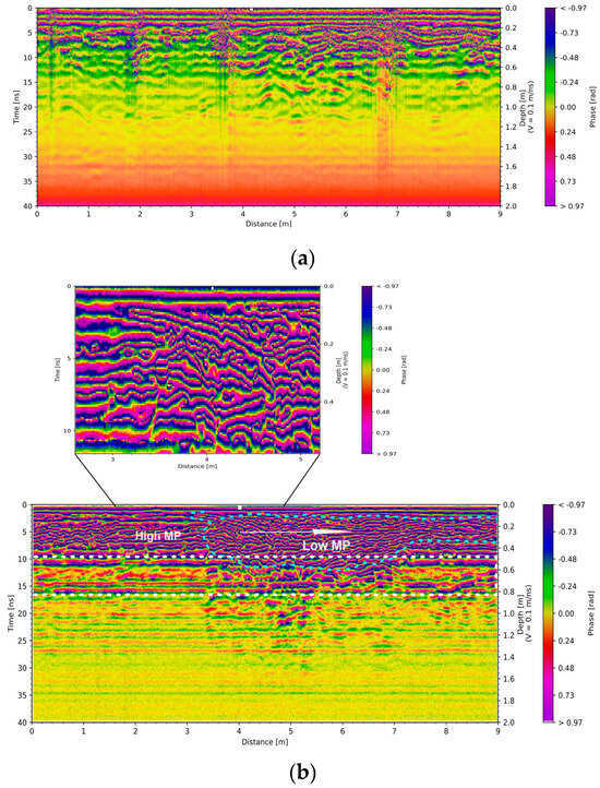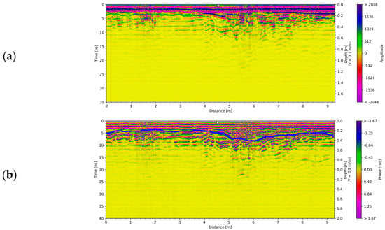 Figure 2. GPR field data presentation before infiltration: (a) processed radargram; (b) calculated phase attribute.