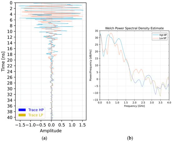 Spectral analysis of the signals at the different zones of consideration is presented in Figure 4b. It is a representation of the power spectral density of the GPR signals at the different areas of consideration. It describes the power present in the signal as a function of frequency, per unit frequency [46]. The magnitude of the lower spectral was higher at the suspected high matric potential, while the reverse was the case at the high-frequency spectral.