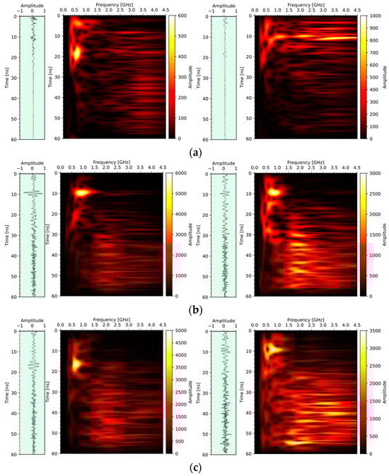 Figure 5. Time-frequency plots from the GPR datasets with corresponding signal traces. (a) Before water infiltration; (b) after 25 L water infiltration; and (c) after 50 L water infiltration.