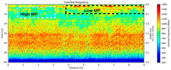 The centroid frequency plot (Figure 6) also corroborated the delineation of matric potential variations within the considered zones in the subsurface. Essentially, the centroid frequency is a spectral decomposition technique that allows the location of the center mass of the signal spectrum as a function of time with distance [47]. It is computed using the weighted mean of the frequencies present in the signal. It is determined using S-transform, with their magnitudes as the weights [48] to represent changes in the propagation condition of the signals. Thus, the value of centroid frequency decreases/increases as the signal enters a high/low attenuation area. In the present scenario, the centroid frequency decreased with depth at the suspected high matric potential (dotted rectangle labeled as High MP in Figure 6) and increased with depth to a depth of about 0.6 m at the low matric potential.