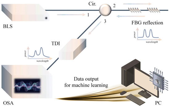 An experimental framework for two FBGs cascading an interferometer for sensing. The sensing data are used for model training and testing of machine learning (BLS: broadband light source; Cir.: circulator; TDI: tunable delay-line interferometer; OSA: optical spectral analyzer; PC: personal computer).