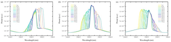 In the strain sensing experiment, the initial center wavelength of both FBGs was 1544.73 nm. The setup used was to fix the center wavelength of one of the FBGs at 1545.1 nm by applying strain. The other FBG was subjected to the strain from the initial center wavelength position of the FBG, and a total of 12 steps of strain application were performed. Finally, the center wavelength position of the FBG was located at 1545.45 nm. Each step was about 60 με of strain application with a 0.06 nm wavelength shift, since the wavelength shift of 1 pm corresponds to about 1 με of strain application. The 60 με strain was realized by shifting the LS by 20 μm. Since the distance between the fixed points on both sides of the FBG was 33 cm, the microstrain on the FBG was 20 μm divided by 33 cm, which is equal to 60 με. However, the moving operation of LS was via manual adjustment of the micrometer head, and with the limitations of the actual resolution of the OSA, there may have been an error of 5 με to 10 με in the application of each strain. From this setup, the spectrum of FBGs can be obtained with no overlap, partial overlap, and almost complete overlap. In order to verify that the overlapped spectra of FBG wavelengths can be successfully interpreted in different interference patterns obtained by fiber-optic interferometry, three different interferometric states of TDI were used to verify the success of the FBG spectra. Figure 2 shows the spectra of the FBG from 0 με to 720 με strain and the unstrained FBG in three different interferometric settings of TDI. The appearance of the interference spectrum is very similar to that of a sinusoidal wave, which shows periodic power modulation as the wavelength changes, and the displacement between the wavelength positions of the troughs is defined as the free spectral range (FSR). Here, the FSR of the three different interference states set by TDI is 2 nm. It can be observed that in the cases of Figure 2a–c, the wavelengths of the unstressed FBGs fall in the left, center, and right halves of one of the 2 nm wide lobes in the interference pattern. The FBG energy is higher in the case of Figure 2b and lower in the cases of Figure 2a,c because the interference power tunes the reflected power of the FBG. Therefore, it can be found that the power of the other FBG under strain will be modulated according to the wavelength position of the FBG and the corresponding power of the set interference.