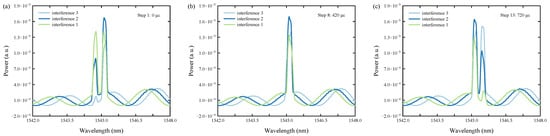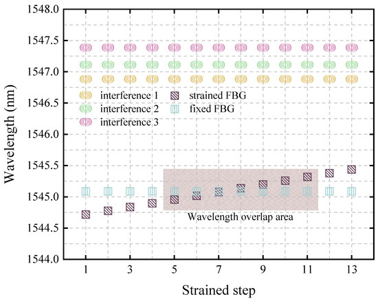 From the above, it can be seen that even if the FBG wavelengths are at the same position, they will be affected by different interferences and thus show different spectra. Figure 3 shows this concept more clearly. Figure 3a–c show the FBG spectra of the first, eighth, and last steps of the strain in three different interferometric states, respectively. It can be seen that the spectra of the two FBGs, both superimposed and un-superimposed, are very different in the three different interference states. Furthermore, as mentioned before, optical sensing mainly utilizes specific wavelength variations for sensing, and sensing based on interferometric spectroscopy either utilizes the wavelength at a certain peak of the spectrum to obtain sensing information or utilizes the wavelength at a certain dip of the spectrum to obtain sensing information. Hence, in this scheme, the wavelength value at the peak of the interference’s lobe on the right side of the FBGs in Figure 3 is assumed to be the main wavelength for determining the sensed information during sensing. The peak wavelengths of the three selected lobe interferences are 1546.88 nm (interference 1), 1547.11 nm (interference 2), and 1547.39 nm (interference 3). Figure 4 clearly shows the fixed sensing wavelengths of the interferometric spectrum for different interference states at each strain step, the theoretical values of the two FBG wavelengths, and the overlapping areas of the two FBG wavelengths under different strain steps.