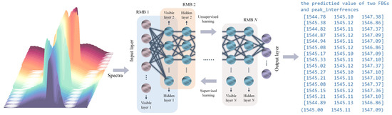 The process of utilizing a DBN for peak wavelength detection in FBGs and interferences involves several well-defined steps, each crucial for building a robust and accurate model. There were 3 different interferometric modes and 13 different FBG strained settings in the experiment, and the total number of interferometric spectral modes and FBG spectral modes of union was 39 different spectra. In order to predict the wavelength accurately in the final DBN model derived from the DBN model training, a total of 20 collections were made for each spectrum, and 780 spectral samples were finally obtained. From these samples, the dataset was split into training (80%) and test sets (20%). Once data were collected, the next phase was data preprocessing, which ensured the raw data were in a suitable form for model training. Thus, the training dataset (i.e., captured reflected spectrum) was preprocessed and normalized between 0 and 1. This involved normalizing the interference patterns to achieve consistency across the dataset. The most critical part of preprocessing is feature extraction, where relevant features indicative of peak wavelengths are extracted from the interference patterns. These features are essential, as they provide the DBN with the necessary information to learn and predict accurately.