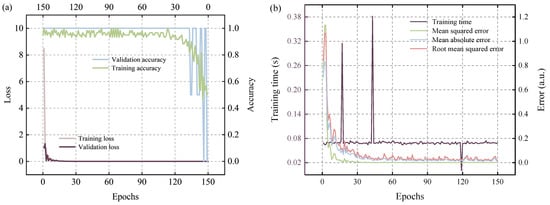 The different parameters, such as epochs, hidden layers, batch sizes, and optimizer and activation functions, were adjusted until an optimal or well-trained model was obtained. The optimal parameters for the well-trained DBN model are crucial in achieving high accuracy in peak wavelength detection. Thus, the optimal parameters used for training the proposed DBN included 3 hidden layers, 32 batch sizes, 150 epochs, the Adam optimizer, and ReLU activation functions in the hidden layers that introduced non-linearity, improving the network’s ability to model complex relationships in the data. Figure 6a shows the DBN’s training performance evaluated through its training and validation losses, as well as training and validation accuracy using these optimal parameters. The training loss and validation loss curves provide insights into the model’s performance during training and on unseen data, respectively. The training loss quickly declined and stabilized near zero at epoch 150 on the bottom x-axis, indicating effective learning of training data patterns. The validation loss also decreased significantly early on and remains stable, showing good generalization to unseen data without overfitting. The training accuracy reached nearly 1.0 (100%) by epoch 150 at the top x-axis, and the validation accuracy also approached 1.0 (100%), though with some variability. In general, the DBN demonstrated strong performance, effectively learning and generalizing from the data, with high accuracy and low loss metrics.