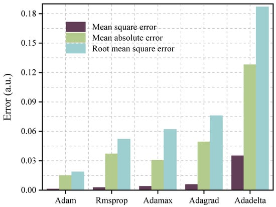 Figure 6b shows that the performance of the DBN for peak wavelength detection of FBG strain sensors was evaluated in terms of prediction error, measured as MSE, MAE, and RMSE, and training time, measured in seconds per epoch. As shown in the figure, the training process showed stabilization of training time after initial fluctuations, indicating computational efficiency. Key error metrics, including MSE, MAE, and RMSE, at epoch 0 were relatively high. However, as training progressed, all significantly decreased, remaining close to zero at 150 epochs, which signifies that the model effectively minimized prediction errors and indicates the DBN’s ability to accurately learn and predict peak wavelengths, demonstrating its reliability and effectiveness for this application. Furthermore, to determine the best optimizer, the model was trained and tested with different optimizers, and their performance was compared based on MSE, MAE, and RMSE. According to Figure 7, Adam achieved lower MSE, MAE, and RMSE values of 0.0012, 0.015, and 0.0187 compared to other optimizers. This was due to its computational efficiency and noise minimization. As a result, the proposed DBN model was trained and tested using the Adam optimizer.