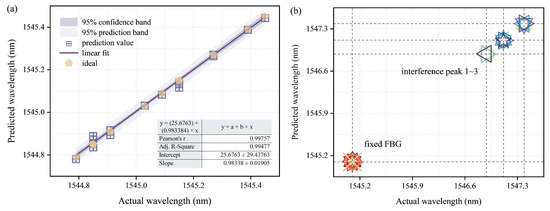 Figure 8 shows the predicted peak wavelengths of the strained FBGs, fixed FBGs, and three different interferences. In Figure 8a, the x-axis represents the peak wavelength of the strained FBGs in reality, while the y-axis represents the peak wavelength of the strained FBGs predicted by the DBN model. The yellow symbols on the graph show the ideal values, indicating where the predicted values should be if they exactly match the ideal values. Along this line, 15 randomly selected prediction data points are positioned to demonstrate the accuracy of the DBN model. The closer these points are to yellow symbols, the more accurate the prediction becomes, suggesting that the DBN model is very effective in accurately predicting the peak wavelength of the strained FBG in the case of overlap with the FBG and interferences. The x-axis of Figure 8b is the marked peak wavelength of fixed FBG and three different interferences, which are 1545.1 nm, 1546.88 nm (interference 1), 1547.11 nm (interference 2), and 1547.39 nm (interference 3), respectively. The y-axis corresponds to the predicted wavelength peak of the DBN model. From the results, it can be seen that the DBN model can also accurately predict the marked peak wavelengths of fixed FBG and three different interferences.